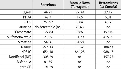 Tabla 2. Concentraciones de algunos EDC (ng/l) en aguas superficiales en España, 2011.7