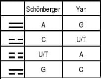 Estos dos estudios comparativos asignan uno de los 4 digramas a uno de los cuatro nucleótidos, pero utilizan correspondencias diferentes: