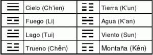 El sistema expuesto en el I Ching está compuesto de 64 configuraciones diferentes de 6 líneas llamadas hexagramas, que representan diferentes situaciones vitales. Cada línea puede ser yin (representada por línea partida) o yang (línea continua). Además, cada línea yin o yang puede ser estable o móvil, lo que da lugar a los 4 tipos de líneas posibles. Así, el lenguaje del I Ching se compone de 4 unidades: yin estable, yin móvil, yang estable y yang móvil, que se representan respectivamente con los números rituales 8, 6, 7 y 9. La combinación de tres líneas yin o yang da lugar a 8 trigramas diferentes, que representan 8 actitudes básicas para trabajar con las energías yin y yang.