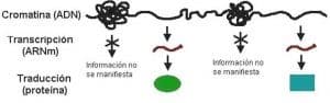 Figura 4. Esquema simplificado de la relación entre la estructura de la cromatina y la expresión génica. Cuando la cromatina está condensada, la información del ADN no se puede expresar. En cambio, cuando la cromatina está abierta, la información se expresa en forma de ARNm y proteína.