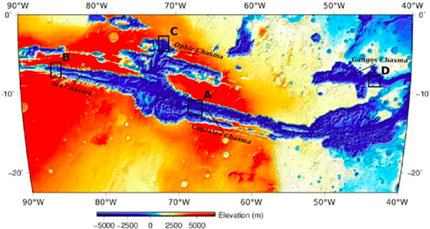 Una de las principales características geológicas de Marte es el Valles Marineris. Con más de 4.000 km de largo, 200 km de ancho y hasta 7 km de profundidad, es el segundo cañón más grande de todo el Sistema Solar, y se extiende por casi un cuarto de la circunferencia del planeta.