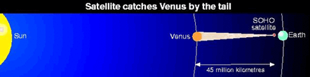 La cola del cometa Venus es muy larga: 45 millones de km (29 millones de millas). Tan larga, de hecho, que su cola de iones llega a la Tierra cuando el Sol, Venus y la Tierra están alineados.