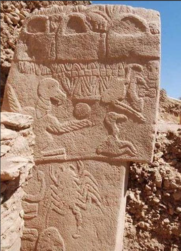 Gobekli Tepe es un sitio arqueológico situado en el sur de Turquía. Su capa más profunda se remonta a hace unos 10.000 años. Su principal característica arqueológica es la piedra del buitre, un enorme pilar tallado también conocido como pilar 43 (imagen de abajo).