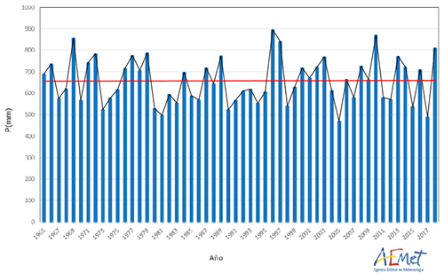 Figura 1. El cambio climático no ha causado ningún cambio en la cantidad de precipitación anual sobre el conjunto de España en 54 años según los datos oficiales de la AEMET. ¿Cómo se justifica una emergéncia en un no-cambio? Pues prediciendo que en el futuro las sequías van a ser espantosas. La línea roja es la tendencia lineal de los datos.