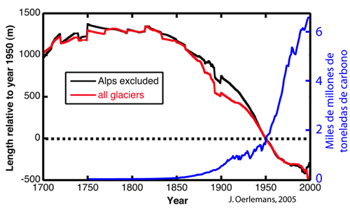 Figura 10. En rojo, disminución media de la longitud de 169 glaciares distribuidos por todo el mundo en metros con respecto a 1950. En negro, la exclusión de los 90 glaciares de los Alpes demuestra que el cambio fue similar a nivel global. En azul (añadido) las emisiones de CO2 en miles de millones de toneladas de Carbono de acuerdo a Boden et al., 2017. Los glaciares empezaron a decrecer en longitud entre 1800 y 1850, cuando aún no habíamos empezado a emitir, y sufrieron su mayor reducción entre 1850 y 1950, cuando nuestras emisiones era comparativamente bajas. La reducción de su longitud ha disminuido en velocidad desde 1950 coincidiendo con el tremendo aumento de nuestras emisiones. Figura original: Oerlemans, J. (2005). Extracting a climate signal from 169 glacier records. Science, 308 (5722), 675-677.