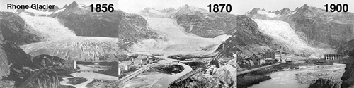 Figura 11. Fotografías realizadas desde una posición similar del Glaciar del Ródano en los Alpes suizos en las fechas indicadas. Podemos observar la rápida reducción de la masa de hielo del glaciar que permitió la sucesiva construcción de infraestructura turística en zonas anteriormente cubiertas de hielo.