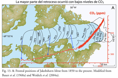 ¿Tenemos evidencias de que nuestras emisiones hayan acelerado el proceso sustancialmente? Algún astuto lector ya se imaginará que si la subida del nivel del mar no se acelera significativamente debe ser porque el hielo de la criosfera tampoco se funde mucho más deprisa. Nos hablan mucho de la pérdida de hielo de Groenlandia. Groenlandia pierde hielo a través de sus glaciares, porque lo que nieva cada año en Groenlandia suele ser más que lo que se funde en toda su superficie. Sin el retroceso de sus glaciares Groenlandia estaría ganando hielo. De entre todos los glaciares de Groenlandia el más famoso es el Jakobshavn Isbræ, uno de los más grandes y rápidos de Groenlandia. A menudo nos hablan de este glaciar para ilustrar el calentamiento de origen humano. Sin embargo los científicos tienen datos que demuestran que este glaciar también está reduciendose desde 1850, y que el ritmo al que lo hace no tiene absolutamente nada que ver con el incremento de los niveles de CO2 en la atmósfera.
