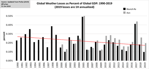 Figura 14. Pérdidas económicas globales debidas a fenómenos del tiempo atmosférico expresadas en porcentaje del PIB mundial. La tendencia (línea roja) es decreciente y el primer semestre de 2019 ha sido particularmente buena. Datos de las aseguradoras Munich Re (negro) y Aon (gris). Fuente: Roger Pielke Jr.