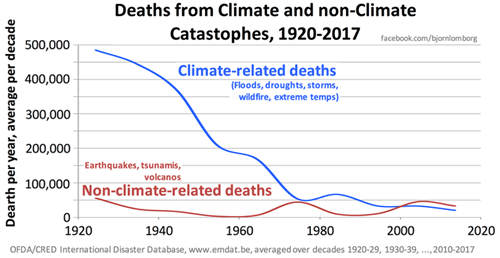 Y por si fuera poco en un mundo cada vez más poblado el número de gente que muere por catástrofes naturales ha caído en picado, porque ahora se dispone de medios de prevención, aviso y rescate, y nos preparamos desde antes de que tenga lugar la catástrofe natural.