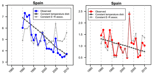 Figura 16. Evolución de la mortalidad atribuible al frío (izquierda) y al calor (derecha) en España. En color están los datos observados, en negro un modelo de adaptación variable a una temperatura constante, y en gris un modelo de adaptación constante a una temperatura variable. Fuente: Vicedo-Cabrera AM et al (2018) "A multi-country analysis on potential adaptive mechanisms to cold and heat in a changing climate." Environment international 111: 239-246.