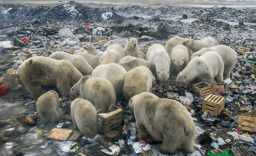 Figura 17. El asentamiento ruso de Belushya Guba fue invadido por hordas de osos polares en Febrero de 2019 por dejar la basura tirada en una época del año en que los osos llevan varios meses sin comer y hay hielo para aburrir. A partir de mediados de Marzo las focas comienzan a parir y empieza el festín. Es cuando hay más hielo en el Ártico, pero los años en que el hielo es muy espeso en algunas zonas los osos tienen mayores dificultades para cazar focas.
