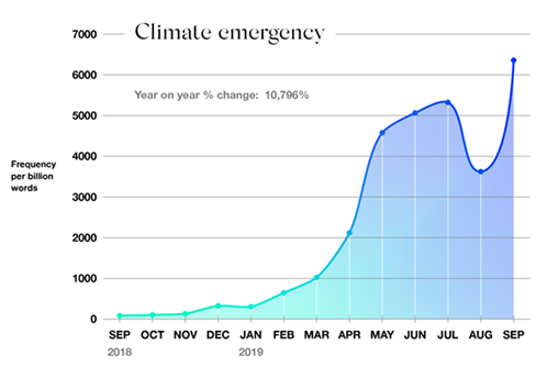 Figura 18. El uso de la expresión "emergencia climática" ha estallado en 2019 desde su ausencia anterior, obviamente por su uso coordinado en los medios. ¿Por qué se ha convertido el cambio climático en una emergencia en 2019? Fuente: Oxford dictionaries.
