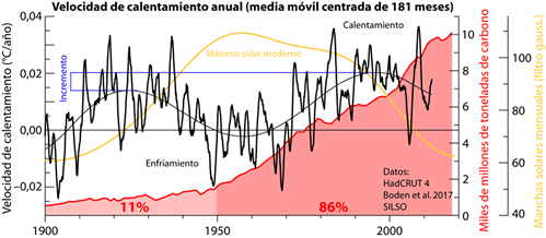 Figura 19. Velocidad de variación de la temperatura mensual de la Tierra de enero de 1850 a octubre de 2019 representada en su media centrada de 181 meses (15 años) entre enero de 1900 y octubre de 2019 (línea gruesa negra). La línea fina es un ajuste polinómico (grado 6) de tendencia. En rojo la variacion de nuestras emisiones de CO2 en miles de millones de toneladas de carbono (ver figura 7). En amarillo la actividad solar en número mensual de manchas solares con un filtro gaussiano para compensar los altibajos del ciclo solar de 11 años. En azul el incremento de velocidad media de calentamiento entre 1925 y 1995.
