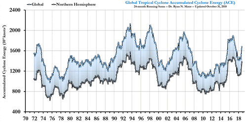 En 2010 los científicos del NOAA (National Oceanic & Atmospheric Administration) nos advertían que la frecuencia de los huracanes más intensos se podría duplicar en las próximas décadas. La realidad como nos muestra el Dr. Ryan Maue es que la actividad ciclónica, tanto en energía como en frecuencia está disminuyendo desde principios de los años 90. Incluso el IPCC en el AR5 indica que las bases de datos actuales no apoyan la existencia de tendencias significativas en ciclones tropicales a nivel global.