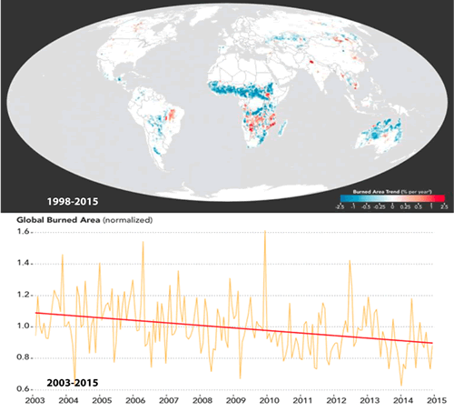 Y sin embargo a nivel global el área quemada por incendios cada año ha disminuido en un 24 % entre 1998 y 2015 según los datos de satélite analizados por los científicos de la NASA. Los científicos creen que la reducción en los fuegos forestales está incrementando en un 7 % la cantidad de CO2 almacenada en las plantas.