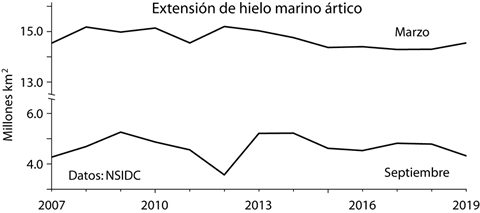 Tienen mucha suerte de que la gente ni se acuerda ni investiga las predicciones pasadas, porque al hielo de la banquisa ártica los científicos lo han dado por finiquitado para el 2008, 2012, 2013, 2016 y 2030. Y sin embargo la extensión de la banquisa ártica en Septiembre de 2019 ha sido superior a la de 2007, y en 12 años no muestra tendencia descendente. Desde luego eso no es ni lo que predijeron ni lo que nos cuentan. Su entendimiento de qué afecta a la extensión de la banquisa ártica es nulo porque no fueron capaces de prever que pudiera no disminuir en doce años… y contando.