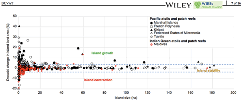 En 1989 Noel Brown, un director del Programa Medioambiental de las Naciones Unidas (UNEP) nos dijo que si para el año 2000 no revertíamos el calentamiento global naciones enteras podrían ser borradas de la faz de la Tierra por la subida del nivel del mar. La realidad es que investigaciones utilizando imágenes desde los años sesenta muestran que el 85 % de las islas del Pacífico o bien están creciendo o mantienen su tamaño, y que las pocas que decrecen son algunas de las que tienen un tamaño muy pequeño (< 10 Ha).