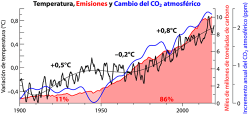 Desde 1950 hemos emitido el 86 % de nuestras emisiones totales de CO2, mientras que entre 1900 y 1950 emitimos tan solo el 11 %. Eso se refleja en que a partir de 1950 se dispara el incremento en los niveles de CO2 en la atmósfera desde menos de una parte por millón (ppm) por año a más de 2,5 ppm/año que sube actualmente. Sin embargo a pesar de emitir ocho veces menos CO2, en el periodo entre 1900 y 1950 se observó un calentamiento de unos 0.5 °C, mientras que en el periodo 1950-2018 con emisiones ocho veces mayores el calentamiento observado fue de unos 0.8 °C. Tan solo 0.3 °C de diferencia. ¿Es ese el efecto del tremendo incremento de CO2 que induce a declarar una emergencia climática, 0,3 °C más en un periodo de siete décadas que cuando emitíamos muy poco?