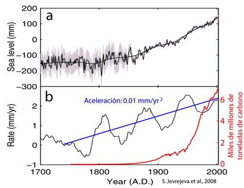 Figura 8. a) Nivel del mar desde 1700 hasta 2000 basado en mareógrafos. b) En negro la velocidad con la que cambia el nivel del mar en mm/año. Se observa una oscilación cíclica de unos 65 años en la velocidad. En azul (añadido) el incremento de la velocidad con respecto al tiempo nos da la aceleración en la pendiente de la recta, que es relativamente constante y de unos 0,01 mm/año^2. En rojo (añadido) las emisiones de CO2 en miles de millones de toneladas de carbono. Como podemos observar la emisión de cantidades brutales de CO2 a partir de 1950 no ha tenido un efecto perceptible ni en la velocidad ni en la aceleración que muestra la subida del nivel del mar. Figura original: Jevrejeva, S et al. (2008) "Recent global sea level acceleration started over 200 years ago?." Geophysical Research Letters 35.8.