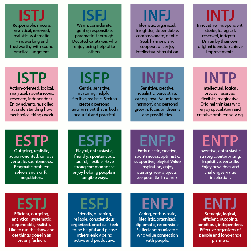 Cada uno de los dieciséis tipos que se obtienen de las combinaciones posibles de estas características se identifica a través de una abreviatura de cuatro letras que corresponden a las cuatro preferencias, que indican el tipo de preferencia en cada dicotomía. Por ejemplo:
