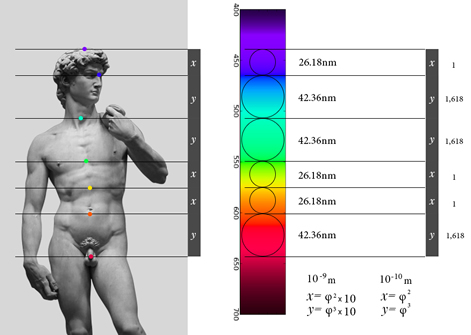 Le doy crédito a Kalana con mucho ingenio y perspicacia para encontrar estas relaciones fascinantes, y le agradezco por llamar mi atención. Siempre me emociona aprender sobre nuevas apariencias y aplicaciones de la Proporción Dorada. También me apasiona usar mi experiencia en auditoría y mis habilidades analíticas para asegurar que lo que se publica en GoldenNumber.net sea lo más preciso posible. El modelo de Kalana se ajusta a las posiciones de los chakras en el cuerpo masculino clásico de David arriba. También se ajusta bastante bien a la ilustración del espectro visible, pero ponemos el modelo a prueba.