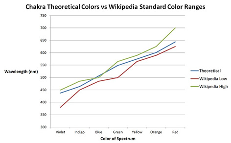 Durante mucho tiempo ha quedado claro que los colores del espectro corresponden a los colores de los chakras. Sin embargo, es asombroso conectar los diversos espacios de separación de los colores ROYGBIV en el espectro con el mismo espacio en los chakras. Descubrir que el espacio está relacionado con la proporción áurea es más que asombroso. ¿Qué llevó a los antiguos del hinduismo a elegir estas posiciones particulares para definir los chakras? Por el contrario, varias tradiciones budistas utilizan 4, 5, 7 o 10 chakras. Los 5 chakras budistas están secuenciados desde la base de la columna hasta la coronilla con colores verde, amarillo, azul, rojo y blanco, que ni siquiera corresponden al espectro visible de la luz. Plantea esta pregunta: ¿Tuvieron los antiguos de la tradición sánscrita e hindú una visión mucho más profunda de la naturaleza de la energía, la luz y el cuerpo humano de lo que la tradición occidental les da crédito?