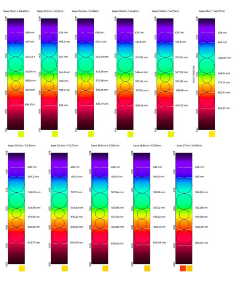 Kalana entonces quiso resolver la cuestión del valor exacto de la base tomando el espectro de referencia y calibrando la longitud de onda del amarillo. Lo hizo tomando 10 bases cada 0,2 nm de 25 a 27 nm. Después de haber establecido un conjunto correspondiente de amarillos, orientó su trabajo a la base de 26,2 nm que parecía corresponder mejor visualmente a un amarillo real. Poco después, hizo la conexión entre 26,2nm y 2,618 (phi al cuadrado) y 42,36nm y 4,236 (phi al cubo).