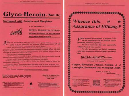 Propaganda de heroína Martin H. Smith Company, de Nueva York. La heroína era ampliamente usada no solo como analgésico, sino también como remedio contra el asma, tos y neumonía.. Mezclar heroína con glicerina (y comúnmente azúcar y saborizantes) volvía al opiáceo amargo más agradable para su ingestión oral.