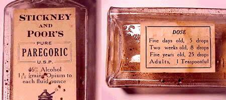Usted cree que nuestra vida moderna es confortable? Antiguamente para aquietar bebés recién-nacidos, no era necesario un gran esfuerzo de los padres, pero si, el opio. Este frasco de paregórico (sedativo) de Stickney and Poor, era una mezcla de opio y alcohol que era distribuída del mismo modo que los condimentoss por los cuales la empresa era conocida.