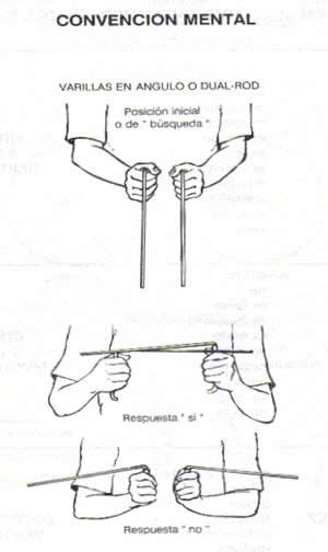 Compré el libro e inmediatamente comence a leerlo; me fui enterando poco a poco de las cosas que se podían lograr con el uso del péndulo y las varillas, no he experimentado con la rama en forma de Y que es usada en la prospección de pozos. Mi primer experimento fue con dos varillas de metal hechas con el alambre de una percha para ropa. Camine por mi cuarto viendo como estas varillas se juntaban y separaban en diferentes lugares de mi habitación, saque la conclusión de que habían diferentes energías recorriendo la misma; curiosamente las varillas se cerraban cuando pasaban por encima de mi almohada.