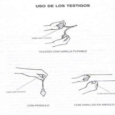 El testigo es un elemento usado para relacionar el instrumento radiestésico con la persona o cosa que se quiera investigar, en la figura siguiente se puede ver como usar los mismos. Puede ser una foto, una prenda, material o mineral buscado.