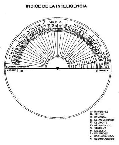 El uso de este cuadrante es muy sencillo, se ubica el péndulo en el punto negro del centro y el péndulo oscilara marcando el valor de la inteligencia de la persona examinada.